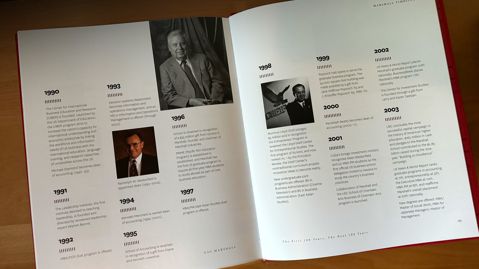 To memorialize their 100th anniversary, I worked with the USC Marshall School of Business to design a coffee table book commemorating their first 100 years. The cloth-covered hardbound book features a historical narrative written by Holly Bridges, USC Marshall Adjunct Professor of Business Communication, as well as archival and historical images from the USC Archive. The publication documents prominent Marshall buildings, donors, as well as USC Marshall students of the last decade. A historical timeline closes out the publication.